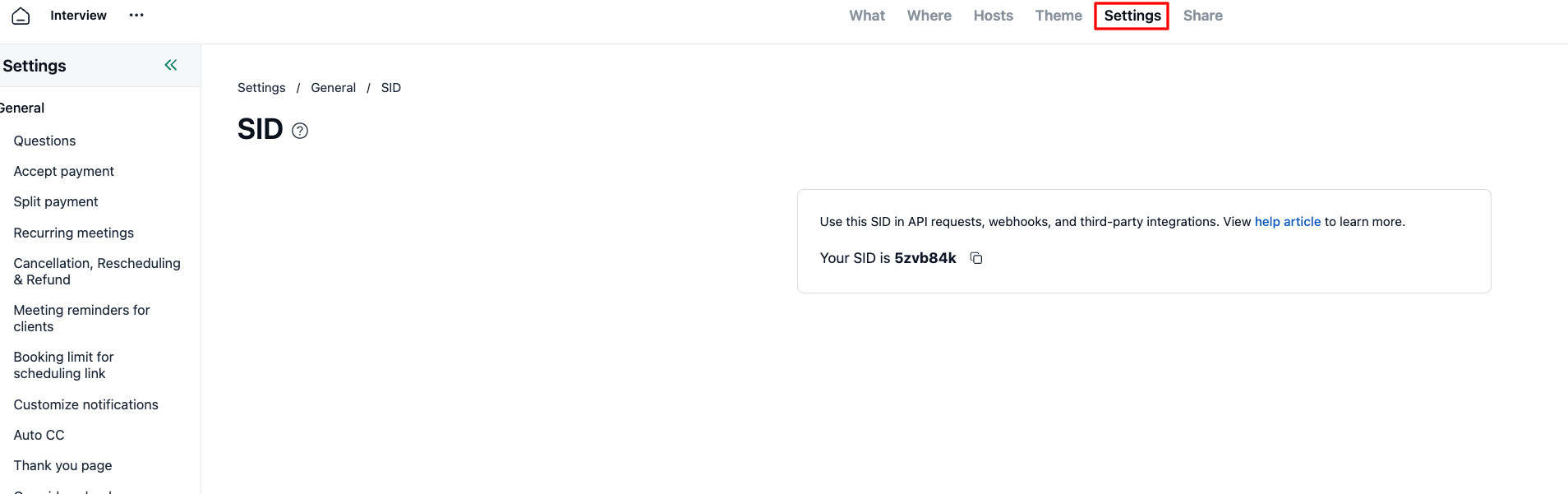 SID is a unique identifier assigned to each scheduling link. You will need this ID when using the API, setting up webhooks, or integrating with external tools.